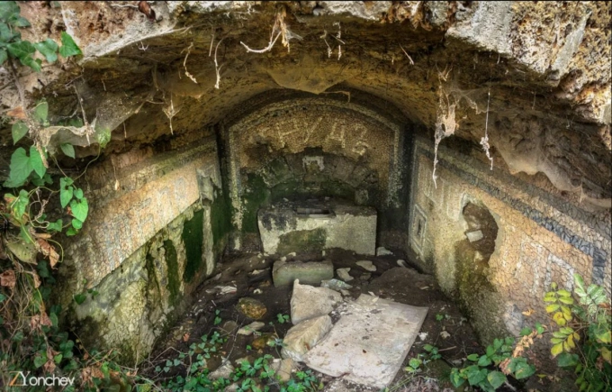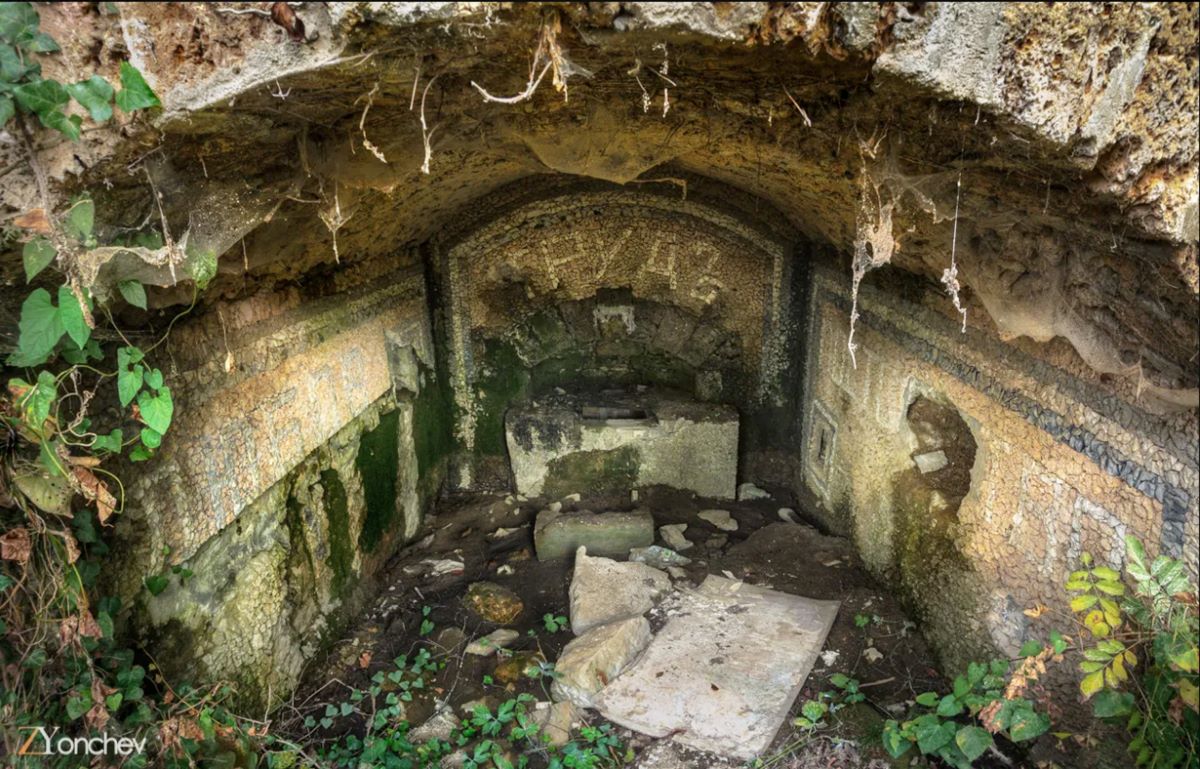 П-образният мозаечен надпис на Пенчо Семов "любов, труд, постоянство". Снимка Здравко Йончев.