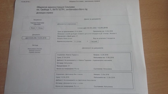 Проследяваме движението на молбата чрез деловодната система на Община Севлиево, откъдето разбираме, че в деня, в който молбата е заведена в деловодството на администрацията, тя е препратена към зам.-кметът Невена Тодорова. Срещу "дейност" е записано "първоначално насочване", а срокът за изпълнение е 27 април. Пак там е написано, че документът е просрочен с 47 дни и е изпълнен, каквото и да означава в случая изпълнен, на 13 юни т.г.