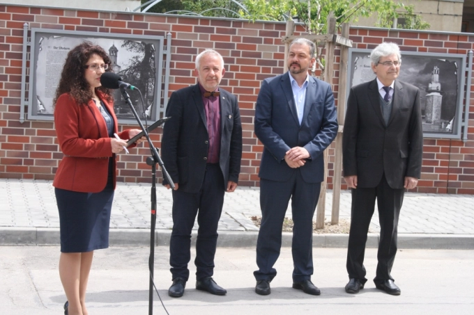 Отляво надясно: Теодора Конова (водещ на церемонията), Тома Томев (президент на Ротари Севлиево), Иван Иванов (кмет на Севлиево), Найден Петров (директор на Исторически музей Севлиево)