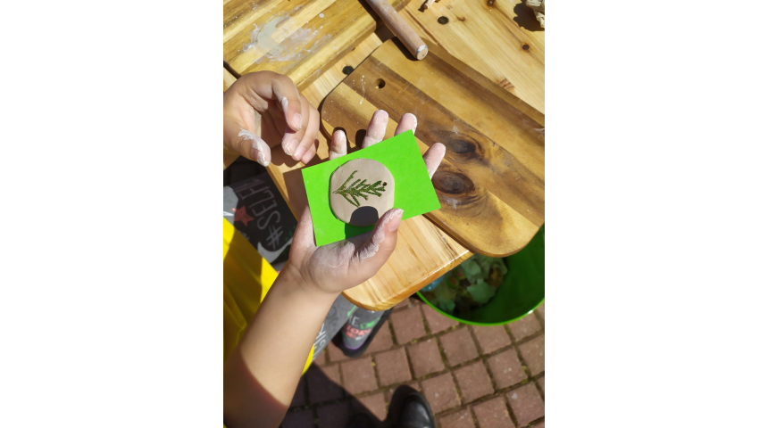 Малчуганите сами си изработиха глинени медальони, които украсиха с отпечатък от листа на дива ягода, папрат, кипарис, миризлив здравец, вратига, сребрист очиболец, бял равнец, леска, габър и други.