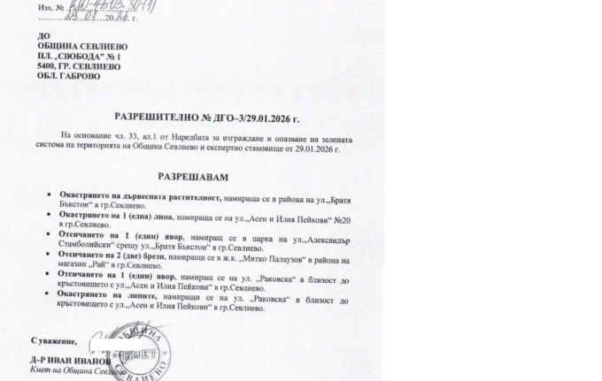 Разрешителното, въз основа на което две брези в ж.к. "Митко Палаузов" бяха отсечени, защото пречеха на нов тротоар, е подписано от кмета на община Севлиево Иван Иванов.