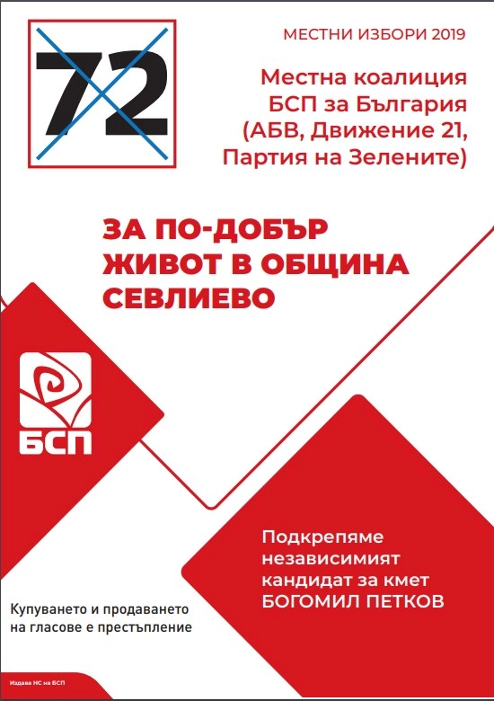 Местна коалиция БСП за България ще открие предизборната си кампания в понеделник, на 7 октомври 2019 г., от 17.30 ч. в хотел "Севлиево плаза" (панорамен бар), с представяне листата на кандидатите за общински съветници, кандидатите за кметове в населените места и независимия кандидат за кмет на община Севлиево, подкрепен от коалиця БСП за България, Богомил Петков.