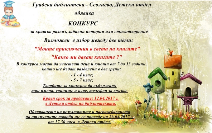 Тази година Градска библиотека – Севлиево ще отбележи двете дати с конкурс за детско литературно творчество. В него могат да се включат всички малки и по-големи приятели на книгите, за които четенето е удоволствие, а прочетеното е извор на вдъхновение.