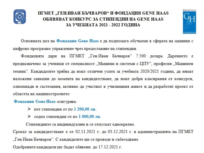 ОбразованиеКонкурс за стипендии обявиха ПГМЕТ в Севлиево и Фондация Gene Haas 03.11.2021 г. пгмет ген иван бъчваров стипендии