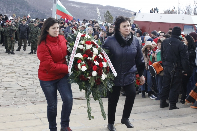 Заедно с Кирил Добрев - водач на листата на "БСП за България" за габровски избирателен район, г-жа Нинова присъства на официалното честване в подножието на върха, а след това двамата изкачиха стъпалата до паметника Шипка, за да отдадат почит на загиналите за свободата на България и да поставят венци и цветя на историческото място.
