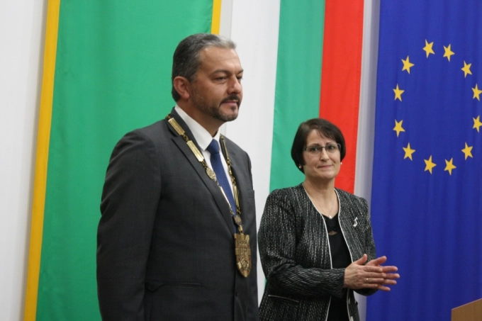 Изпълняващият длъжността кмет на община Севлиево инж. Красимира Йорданова връчи по-рано днес огърлицата - символ на местната власт, на избрания за трети мандат кмет на Севлиево Иван Иванов. "Аз знам, че Вие имате куража да следвате мисията си, да работите в името на хората от община Севлиево", каза Йорданова в емоционално приветствие към избрания за кмет.