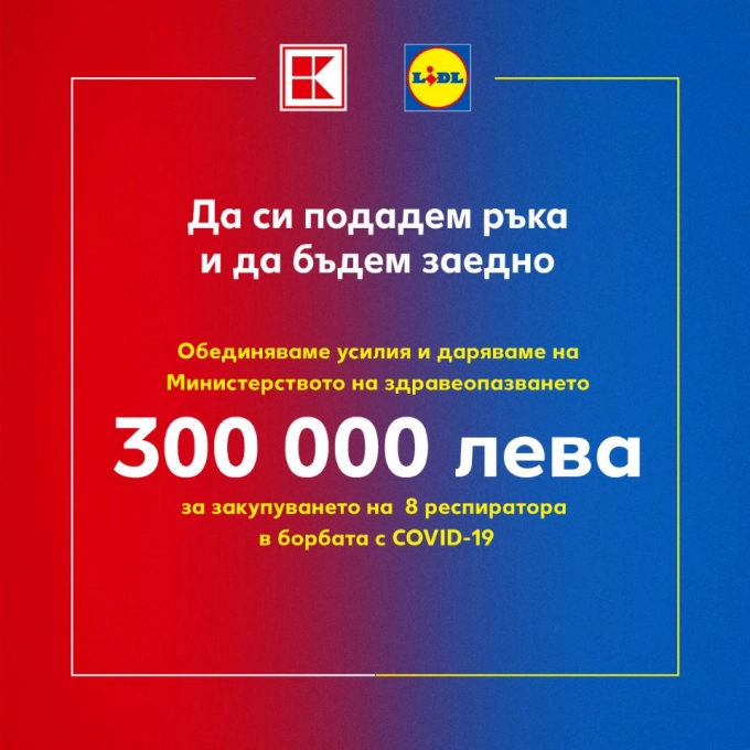 Лидл България и Kаufland България даряват 300 000 лева за закупуването на 8 дихателни апарата, които ще бъдат предоставени безвъзмездно на Министерството на здравеопазването. Двете компании, които са част от германската група Schwarz, обединяват усилия в ситуация на извънредно положение и в желанието си да дадат своя принос в борбата с разпространението на коронавируса у нас и грижата за здравето на българските граждани, пишат оттам в разпространено прессъобщение.