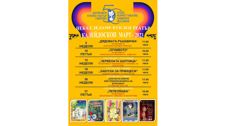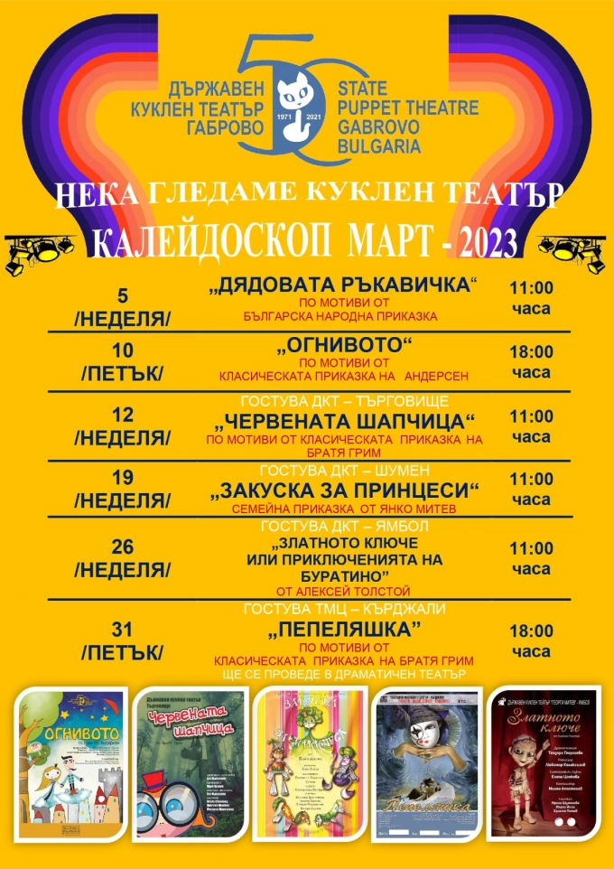 Куклен театър - Габрово за трета поредна година кани добрите детски представления, продуцирани от професионални театри в страната. Според програмата на тазгодишния мартенски калейдоскоп на сцената ще видим историята на Пепеляшка, на Червената шапчица и ще се сгушим в дядовата ръкавичка. Това не е пълната програма на събитието, което организаторите определят като подходящо за семейна публика.