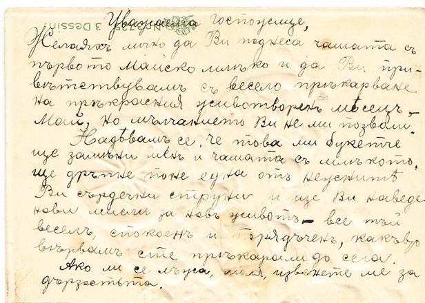 Желаех лично да Ви поднеса чистотата съ първото майско мляко и да Ви приветствувам съ веселото прекарване на прекрасния животворен месецъ май, но мълчанието Ви не ми позволи.