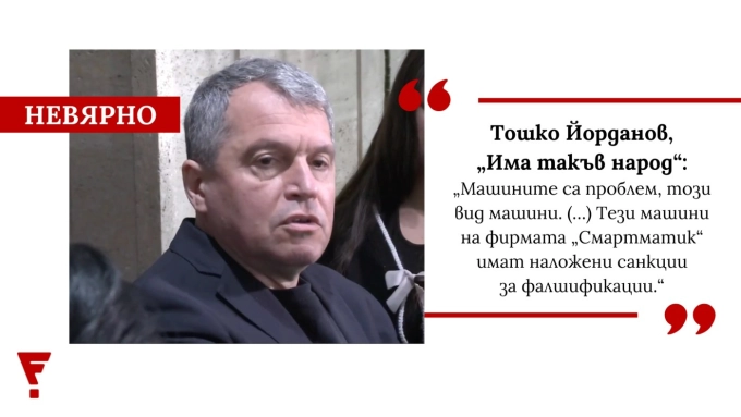 На 11 март 2026 г. Тошко Йорданов, заместник-председател на „Има такъв народ", заяви в кулоарите на Народното събрание, че компанията „Смартматик" - производител на машините у нас - има наложени санкции за фалшификации. Каза още, че нито устройствата, нито софтуерът са собственост на държавата.