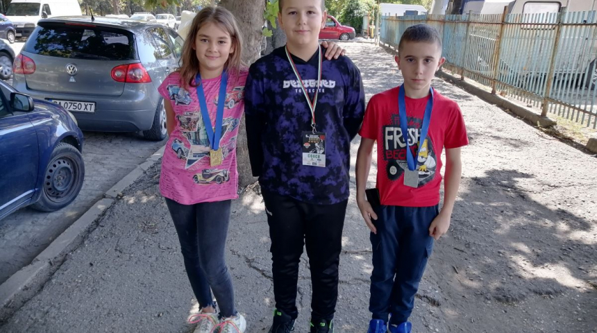 Шампионката Мелиса Халил със съотборниците си Владимир Фукаров (до нея) и Иво Тодоров, снимка: СК "Раковски"
