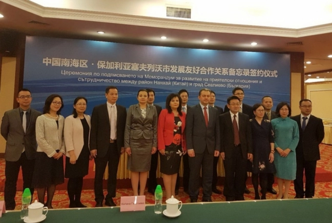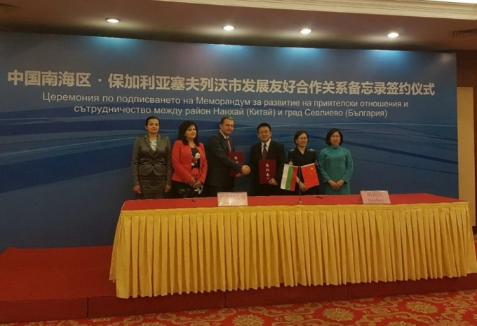Меморандум за развитие на приятелско сътрудничество са подписали кметовете на Севлиево и Нанхай, съобщават от Община Севлиево чрез официалния си сайт. Церемонията по подписването се е състояла на 23 април в район Нанхай, град Фошан, провинция Гуандун на Китайската народна република, където на посещение е кметът д-р Иван Иванов, заедно със заместничките си Калина Георгиева и Невена Тодорова. Това е първият етап от развитието на партньорство между двата града, се казва още в разпространената информация. Следващият ще бъде през септември, когато китайска делегация ще пристигне в града ни.