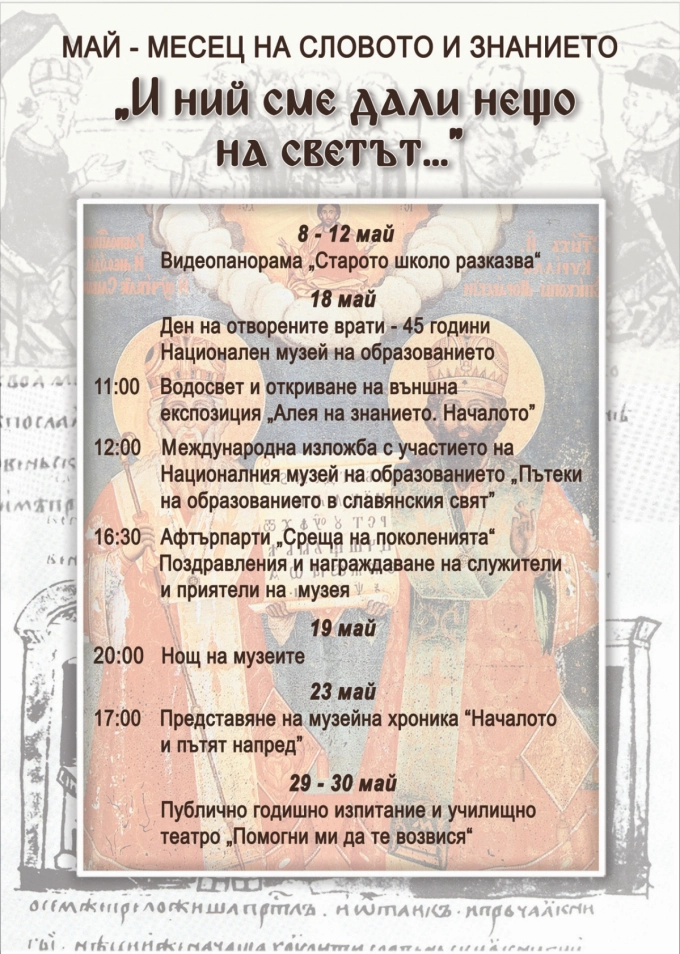 Под мотото „И ний сме дали нещо на светът...” в Националния музей на образованието за втори път се провежда Месец на българското слово и знание. Идеята на ежегодната инициатива е да търсим и помним поводите за национално самочувствие в историята, да живеем с него и да то предаваме на поколенията чрез слово и знание, съобщават от ръководството на музея.