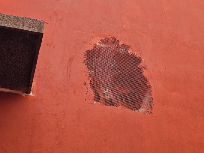 На място се виждат груби пропуски. По външните стени мрежата е оголена и пада заедно с мазилката – признак за липсващ грунд или неправилно нанесен лепилен слой. С други думи – фасадата не е изпълнена по технология.