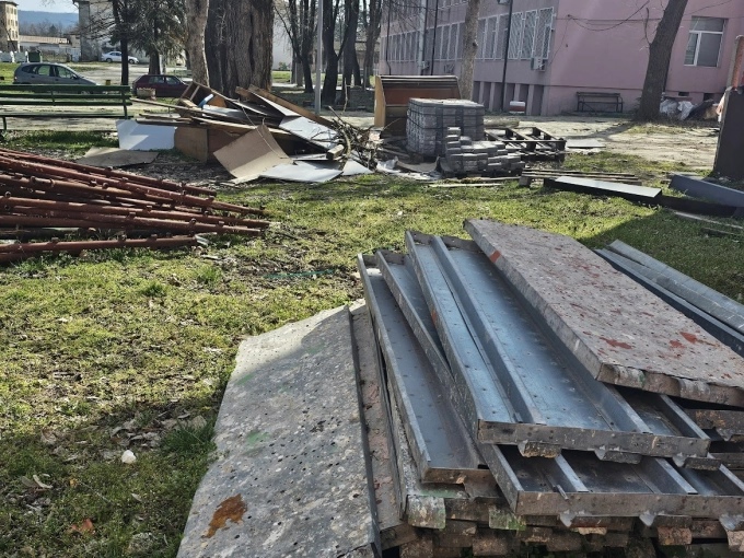 Състоянието на болничния двор допълнително затвърждава впечатлението за хаотична и недовършена работа – разхвърляни строителни отпадъци, елементи от скеле и кофи с материали създават картина, по-скоро напомняща изоставен строителен обект, отколкото финализиран ремонт за милиони лева. Няма как да бъде обяснен и залятият с циментова смес дънер в задния двор на болницата, което говори за пълно безхаберия от страна на строителите към околната среда.