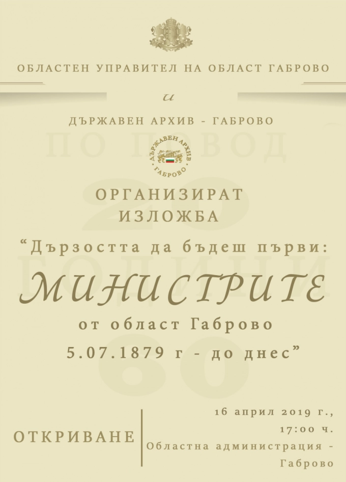 През 2019 г. се отбелязва 140- годишнината на българския парламентаризъм. В Габрово, по инициатива на Областна администрация – Габрово, която тази година посвещава публичните си изяви на 20-годишнината от създаването си, бе решено този дата да се отбележи с изложба „Дързостта да бъдеш първи: Министрите от област Габрово от 5 юли 1879 г. - до днес“, подготвена от Държавен архив – Габрово.