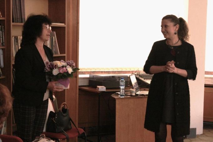 Директорът на Градската библиотека Добрина Минкова благодари на Миролюба Бенатова, снимка: "Севлиево онлайн"