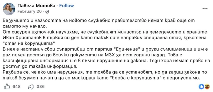На 20 февруари например Митова публикува в профила си пост, в който твърди, че служебният министър на земеделието и храните Иван Христанов е определил специална стая „на корупцията“ и там е дал достъп на свои съмишленици от партия „Единение“ до „всички документи на МЗХ за пет години назад“, какъвто достъп те по закон не би трябвало да имат. Христанов е сред служебните министри, които са обект на най-ожесточени атаки от страна на „Има такъв народ“.