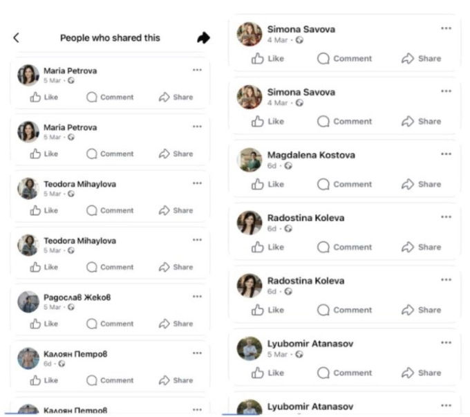 Така чрез мрежа от неавтентични профили с изфабрикувани снимки и без реални лични постове публикацията на Павела Митова от 20 февруари получава най-малко 120 допълнителни споделяния. Големият брой на реакциите и споделянията я поставя в категорията на силно ангажиращо съдържание във Фейсбук, води до приоритетното ѝ позициониране и увеличава видимостта ѝ.