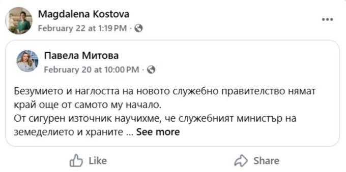 Точно такъв е случаят с поста на Павела Митова от 20 февруари. Той е споделен от фалшивия профил Magdalena Kostova два пъти на 22 февруари:
