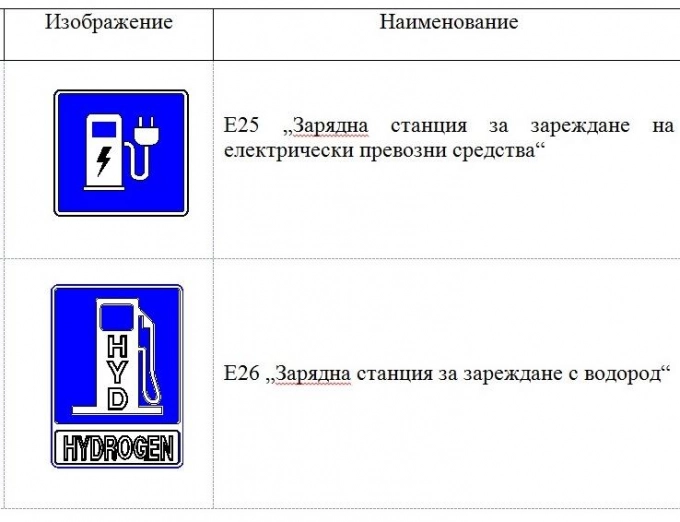 Предвидени са специални пътни знаци, указващи наличието на зарядни станции за електрически превозни средства и станции за зареждане на автомобили с водород.