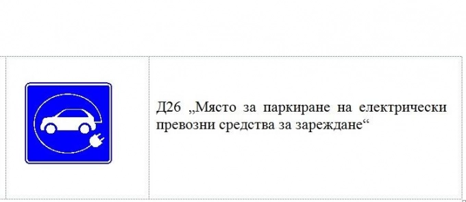 Въвежда се и специален пътен знак за паркиране на електрически превозни средства за зареждане - Д26. В утвърдените символи за изобразяване на видовете превозни средства се добавя и символ на „Електрическо превозно средство“.