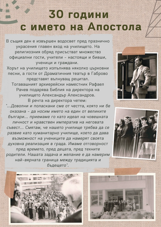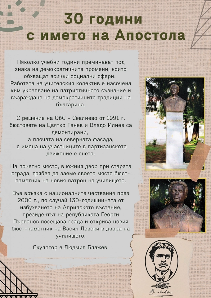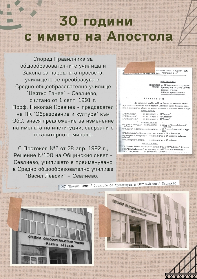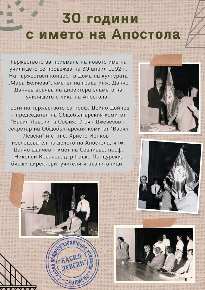 Тази година се навършват 30 години откакто училището има за свой патрон Левски. По този повод в сградата са подредени информационни табла, които разказват как е приет новия патрон. Техен автор е Борислав Маринов. Ето какво е издирил и разказал той (публикува се със съкращения, б.р.):