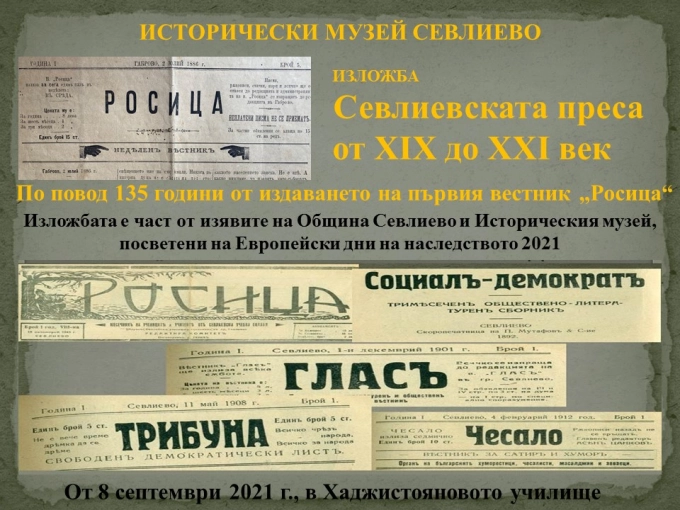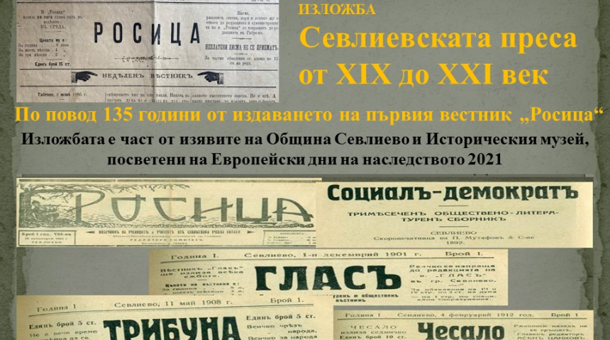 Изложбата „Севлиевската преса от ХІХ до ХХІ век“ е отворена за посетители от вчера в Исторически музей Севлиево. В нея са представени вестници и списания, запазени във фонда на Музея, част от над сто издания на множеството печатници и издателства в града ни от Освобождението до наши дни.