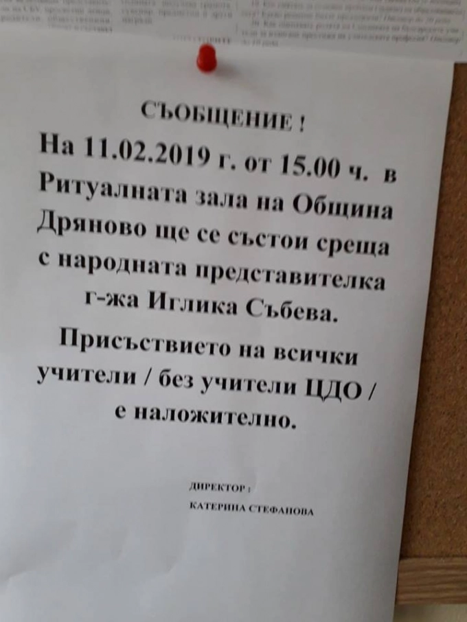 Според съобщение, разлепено на видно място в учителската стая на едно от дряновските училища, "на 11 февруари, от 15.00 ч., в ритуалната зала на Община Дряново, ще се проведе среща с народната представителка г-жа Иглика Събева. Присъствието на всички учители, без учители ЦДО, е наложително". Следва името на директора Катерина Стефанова.