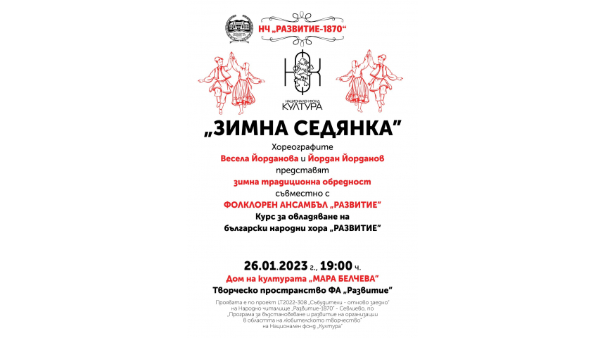 Събитието ще се състои на 26 януари, от 19:00 ч., в творческото пространство на Фолклорен ансамбъл „Развитие” в Дом на културата „Мара Белчева”.