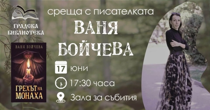 На 17 юни Градската библиотека в Севлиево е домакин на среща с Ваня Бойчева - един млад автор, който ще представи дебютния си роман "Грехът на монаха".