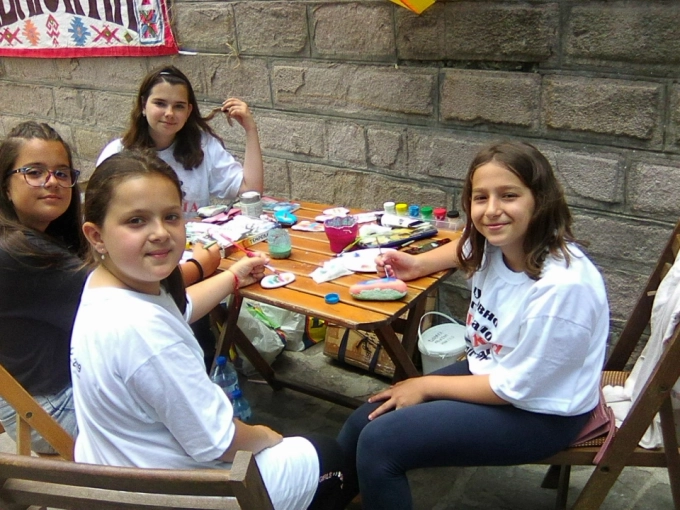 Цветелина Бойнова на 13 г. и Девина Деянова на 10 г. рисуваха върху камъчета елементи и мотиви от български шевици, част от българската идентичност, и привличана интереса и вниманието на гостите в Стария Пловдив.