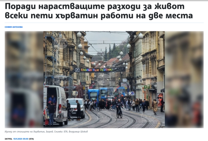 През ноември в някои новинарски сайтове и в социалните мрежи започна да се разпространява твърдение, че заради растящите разходи за живот всеки пети хърватин има допълнителна работа. Новина с такова съдържание е разпространена от Българската телеграфна агенция (БТА), която цитира хърватската информационна агенция ХИНА. Материалът е препечатан и от други сайтове като Bulgaria On Air.
