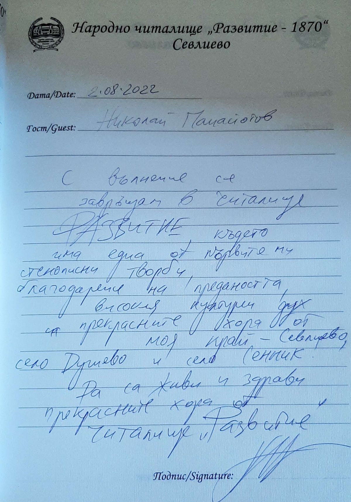 Ето какво написа Николай Панайотов в читалищната летописна книга: „С вълнение се завръщам в читалище „Развитие”, където има една от първите ми стенописни творби, благодарение на предаността, високия културен дух на прекрасните хора от моя край – Севлиево, село Душево и село Сенник”, пожелавайки читалището да продължи да бъде духовният център на град Севлиево".