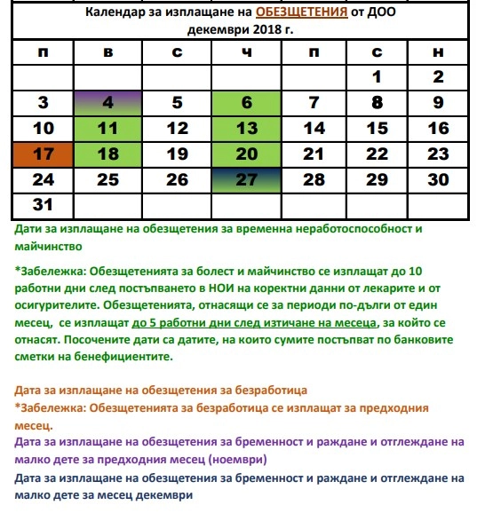 Във връзка с предстоящите празнични дни Националният осигурителен институт (НОИ) променя графика за изплащане на обезщетенията за бременност и раждане и отглеждане на малко дете за декември 2018 г.