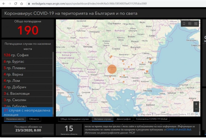От миналата седмица на този сайт https://arcg.is/1LK1TW всеки може да се информира за броя потвърдени случаи на коронавирус по населени места и области в България, както и за техния статус. Данните са представени обобщено в няколко информационни табла, като същевременно могат да бъдат лесно преглеждани и директно от картата. В комбинация с тази информация е интегрирана и демографска статистика за дела на възрастното население над 65 години, представена визуално по области и общини.