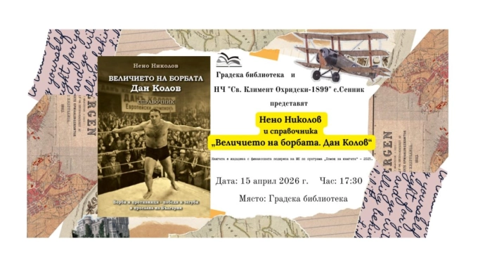 Читалище "Св. Климент Охридски-1899" в с. Сенник и Градската библиотека в Севлиево, чрез отдел „Краезнание“ и клуб „Краевед“, канят жителите и гости на региона на представянето на най-новото издание на Нено Николов – справочник, посветен на живота и спортния път на един от най-великите български борци Дан Колов.