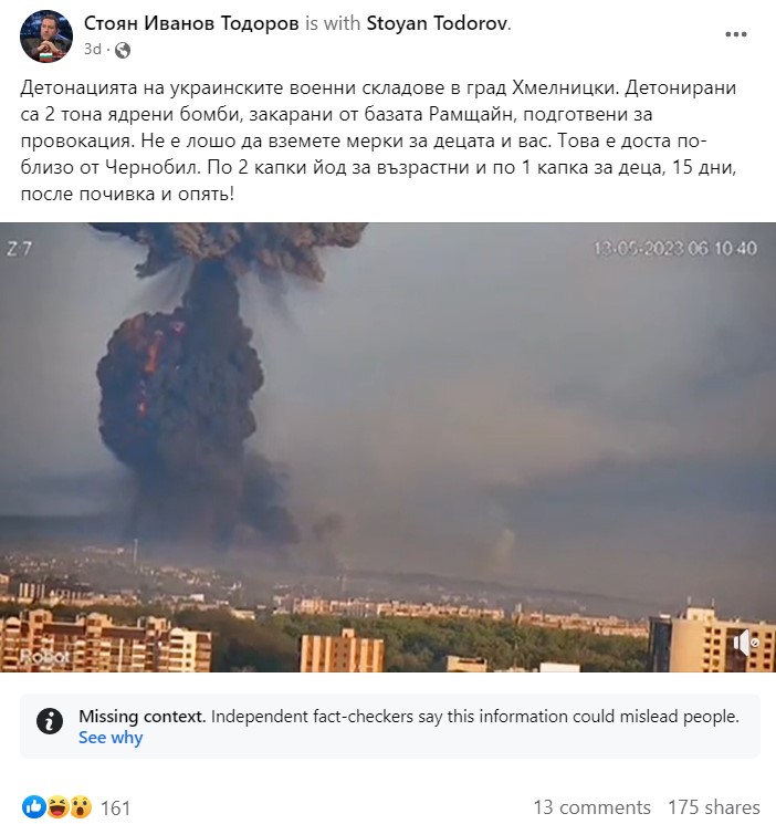 Информацията за „рязко радиоактивно изпускане“ в района на Хмелницки се разпространява от руски профили в социалните мрежи още от първите дни след удара по оръжейните складове, а през миналата седмица в разгласяването й се включиха множество руски медии, както и и няколко български информационни сайта.