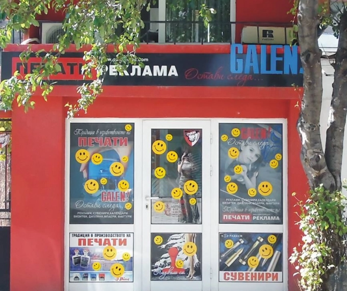 Облепен в усмивки посрещна днешния ден офисът на рекламна агенция "Гален" на улица "Росица". Минувачи се спираха и поглеждаха витрините, а клиентите направо питаха какво се случва. Оказа се, че десетките усмивки имат една цел - да победят агресията. А посланието от Юлия и Галин Ганчеви, собственици на агенцията, и техният екип е: "Усмихни се! Бъди дружелюбен".