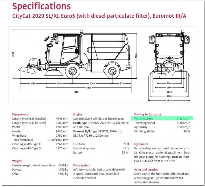Технически параметри на машината, според сайта на производителя, в цвят е маркирана скоростта при работа 0-12 км/ч.