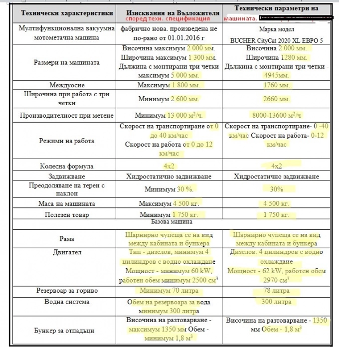 Сравнителна таблица, от която се вижда, че техническата спецификация на обществената поръчка, преди да бъде прекратена, се припокрива с параметрите от спецификацията на конкретна машина