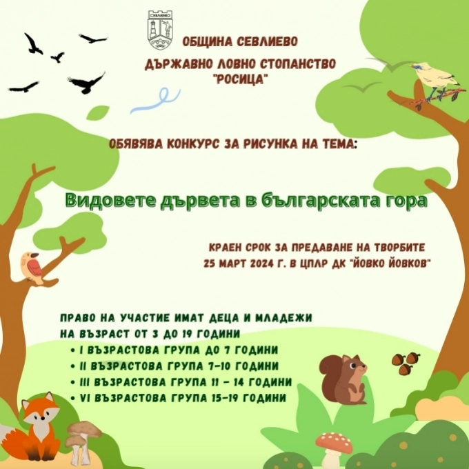 По повод Седмицата на гората Община Севлиево и Държавно ловно стопанство "Росица" обявяват конкурс за рисунка на тема "Видовете дървета в българската гора".