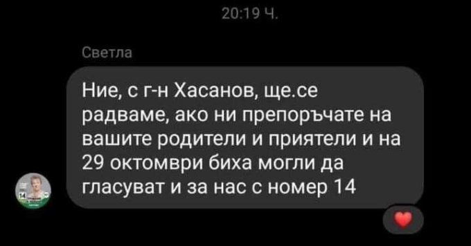 Сигналът, по който е разпоредена проверката, е за съобщение, което се твърди, че е отправено от името на Светлана Георгиева - кандидат за кмет на община Севлиево и водач на листа за общински съветници, към участниците в чат групата. В него се казва: „Ние, с г-н Хасанов, ще се радваме, ако ни препоръчате на вашите родители и приятели и на 29 октомври биха могли да гласуват и за нас с номер 14“.