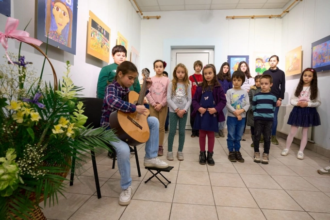 Графики и живопис, портрети, пейзажи, натюрморти и композиции украсиха Синята галерия в една колоритна, провокативна и интересна експозиция с тематично разнолики творби, сътворени от талантливите художници, обучаващи се как да изразяват себе си чрез средствата на изкуството. Как децата общуват в образи на белия лист, какво ги вдъхновява и как небитието става битие чрез сърцето, ръцете и любовта на твореца разказа преподавателят им Велизар Захариев, който с много любов, внимание и професионализъм моделира и изгражда таланта на възпитаниците си. С изпълнение на „Валс” китаристката Велизара Костова поздрави художниците от ръководството на читалище „Развитие” и демонстрира симбиоза между изкуствата чрез картини и музика.
