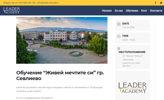 "Ще обсъдим заедно дали това отговаря на истината, ще разберете как можете и вие да влияте на средата и да си създавате продуктивна среда, в която се развивате и осъществявате мечтите си", пише в анонса за обучението на сайта на Leader Academy. И още от там: