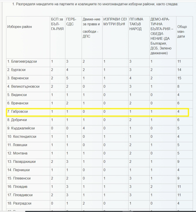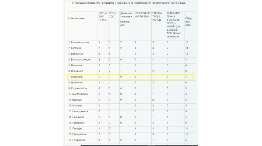 В избирателен район Габрово четирите мандата отиват при четири различни партии - по един за ГЕРБ-СДС, "Има такъв народ", "Демократична България" и БСП.