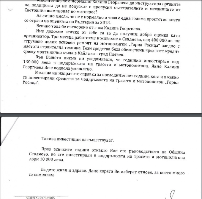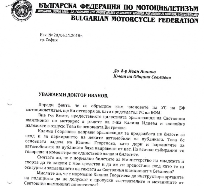 А тези дни "Севлиево онлайн" получи и копие от писмото, което Богдан Николов е изпратил до Община Севлиево. В него Николов пита кмета на Севлиево "Смятате ли че е нормално билетите за Министерството за младежта и спорта да ги закупя със собствени средства и да им ги предоставя, при положение, че те са платили таксата за световния шампионат в Севлиево?". И още: "Мислите ли че е нормално Калина Георгиева да инструктира органите на полицията да не допускат с порпуски състезатеите и механиците от световния шампионат?".