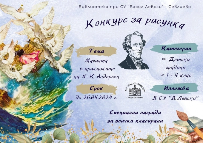 Библиотеката при Средно училище "Васил Левски" в Севлиево обявява конкурс за рисунка, посветен на творчеството на Ханс Кристиан Андерсен. Тъй като няма дете, нито малко, нито пораснало, което да не е притрепвало от вълнение и нетърпение да научи какво се случва накрая в приказките на големия датски писател, темата на конкурса е "Магията в приказките на Андерсен".