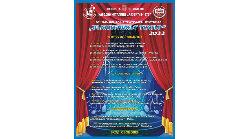 Това е Дванайстото издание на Националния фестивал "Вълшебникът театър". Всички постановки са със свободен вход, малки и големи са добре дошли, казаха от Читалището.