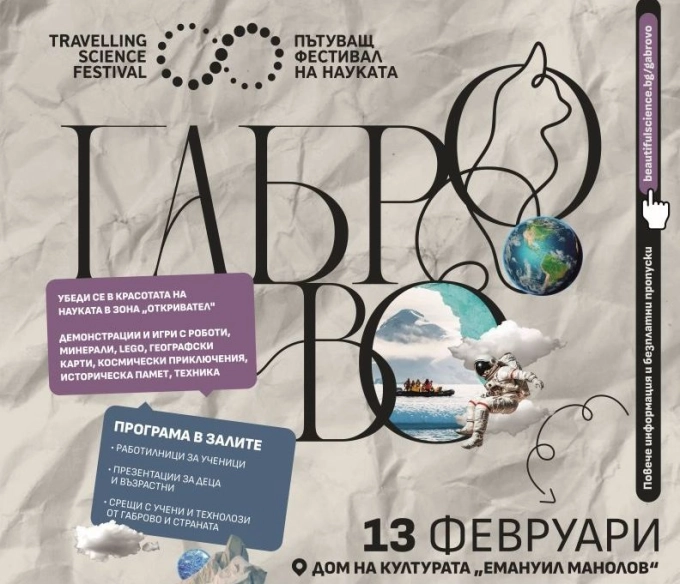 От минерали с планетарен произход на Земята и ледниците на Антарктика до космически технологии. От лъжите в географските карти до истините за вируси в променящия се климат. От науката за динозаврите до технологиите и храните на утрешния ден. В петък, 13 февруари 2026 г., в Дома на културата „Емануил Манолов“ Фондация „Красива наука“ и Община Габрово организират еднодневен празник на науката и технологиите с участието на изследователи и инженери от региона и страната.